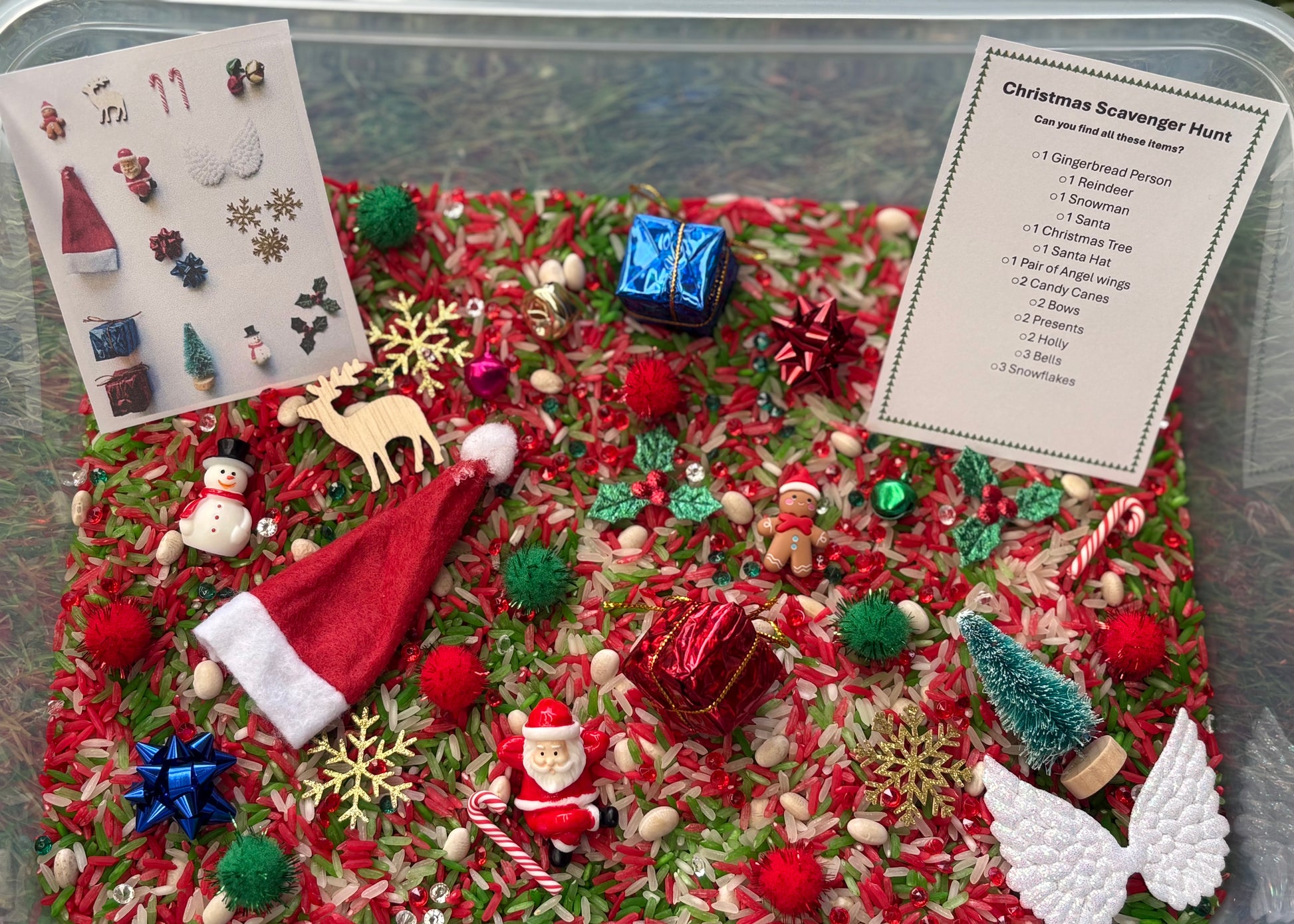 Children will love pouring, scooping, and exploring their way through a wonderland of textured materials, uncovering hidden Christmas treasures along the way. From candy canes to Santa hats, snowflakes, and reindeer β little ones are invited to find them all in this interactive scavenger hunt experience!
